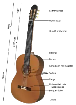 Eine Gitarre hat einen Hals, über dem zwischen Sattel (am Kopf) und Steg (auf dem Korpus) Saiten aufgespannt sind. Die Saitenstärke variiert je nach Stimmung und Mensur. Da die Gitarre, ein sogenanntes Querriegelinstrument, aus dem Korpus und einem davon deutlich abgesetzten Hals besteht, rechnet man sie (im Gegensatz zu den einfachen Chordophonen wie den Zithern) zu den zusammengesetzten Chordophonen.