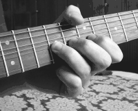 - Dämpfen (französisch Étouffez): Durch Setzen der Greiffinger auf die Bünde kann eine dumpfe, perkussive Klangwirkung bzw. eine so genannte Dead-Note (in Noten und Tabulatur dargestellt durch ein „x“) erzielt werden.[28] Daneben werden, insbesondere bei verzerrtem und lautem E-Gitarrenspiel, auch nichtgezupfte Saiten gedämpft, um deren Mitschwingen und damit Nebengeräusche und eine unerwünschte akustische Rückkopplung (Feedback) zu verhindern.