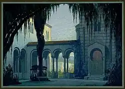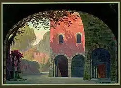 Die zarten Säulen stechen kahl im Glühen der unsicheren Morgendämmerung heraus. Tiefer Frieden. Auf der rechten Seite die erleuchtete Kapelle der Capuleti und – drinnen – auf dem Sarkophag liegend, unter dem Licht der Lampe, bedeckt mit Schleiern und Blumen, schläft Giulietta. Romeo kommt von unten, gefolgt von einem Familienmitglied. Auf seinen zerzausten Haaren und seinem aufgeweichten Gesicht hat er noch den Wind des Ritts. Leise stöhnt der letzte ersterbende Donner. Romeo erblickt das Licht, sieht Giulietta und stößt einen Seufzer aus.