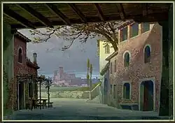 Im Hintergrund ein kleines niedriges Haus mit einem Säulenvorbau und einigen groben Tischen in der Nähe der Tür einer Taverne, die innen durch rötliches Licht erleuchtet ist. Auf der linken Seite ein Weg, der durch die Wände des kleinen Hauses und die hohen und massiven Mauern des Palasts der Capuleti gebildet wird. Auf der rechten eine Brücke. In Nähe eine andere, ebenfalls erleuchtete Taverne mit einer Glastür. Es ist Nacht. Flackernde Lichter in der Ferne hinter der Brücke. Im Licht der Tavernenfenster entstehen und verschwinden die Schatten der Männer im Inneren. Stille. Ein verhüllter Edelmann erscheint auf der Brücke, hält an der benachbarten Taverne an, schaut durch die Fenster, überquert dann den Platz bis zum Säulenvorbau. Plötzlich öffnet sich die Tür dieser Taverne. Licht strahlt heraus. Drinnen sieht man Angehörige der Familie, die schläfrig den Kopf auf den Tisch gelegt haben und andere, die um einen Herd herum liegen. Der Edelmann macht eine tadelnde Geste.