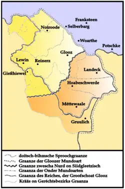 - Nordglätzisch (Niederdörfisch) Gebiete von Neurode, Braunau und Glatz, nördlicher Teil des Adlergebirges beiderseits der Grenze und