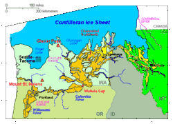Der Kordilleren-Eisschild staute auch den Clark Fork River und bildete den Glacial Lake Missoula, der hinter einem 2.000 ft (ca. 600 m) hohen Eisdamm Täler im heutigen West-Montana überflutete. Über 2.000 Jahre hinweg brach der Eisdamm immer wieder und gab mit den Missoula-Fluten etwa 40 großvolumige Wassermengen frei, die den Abfluss des Columbia River nutzten und den Glacial Lake Columbia durchflossen. Die erste (und wahrscheinlich größte) Flut umfasste eine Wassermenge von etwa 2.500 Kubikkilometern; kleinere Fluten folgten im Abstand von etwa 20 … 80 Jahren.[3] Seit der Glacial Lake Columbia hinter dem Okanogan-Lappen (bis zu 1.300 ft (ca. 400 m) hoch) eingeschlossen war, blockierte der Lappen effektiv den normalen Verlauf des Columbia River, staute die Missoula-Fluten und zwang das Wasser, über einen Großteil des heutigen Ost-Washington abzufließen. Die Erosion der Fluten schuf die Grand Coulee, die Dry Falls, die Palouse Falls und die Channeled Scablands im heutigen Ost-Washington.[2]