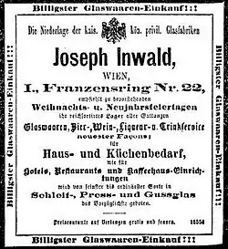 Begründer der Glas-Fabriken war Josef Inwald (1837–1906), der sein Unternehmen mit Sitz in Wien als Alleininhaber leitete. 1862 eröffnete er die Hohlglasraffinerie Rudolfsthal bei Deutschbrod und siedelte dort 14 Arbeiterfamilien an. 1874 ließ er eine zweite Raffinerie in Deutsch-Schützendorf errichten, in der bald 400 Arbeiter Kristallglas, Farbenglas und Beleuchtungskörper produzierten. Da sich diese beiden Standorte nicht weiter ausbauen ließen, folgte 1878 die Gründung einer Glasfabrik mit 500 Arbeitern in Slichow bei Prag, deren Gelände sich über 30.000 Quadratmeter erstreckte und in der hauptsächlich industrielles Massenglas hergestellt wurde.[2] An den beiden älteren Standorten wurden vorrangig hochwertige Produkte hergestellt wie etwa Tafelservice aus Musselinglas.[3] Aus diesen Unternehmen entwickelte sich in den folgenden 30 Jahren „einer der wichtigsten Glashersteller Mitteleuropas“.[4]