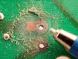 Die durch die Benutzung des Glasfaserradierer freigesetzten Glasfaserpartikel, die oft mit bloßem Auge nicht zu erkennen sind, können die Haut reizen, in diese eindringen oder eingeatmet werden, weshalb eine Entfernung per Hand oder durch Pusten nicht angebracht ist.