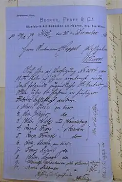 Über die Besitzverhältnisse der Glashütte sind heute keine genauen Informationen mehr verfügbar. Teilweise ist in den Akten und der Literatur von verschiedenen Besitzern namens Becker die Rede, doch führte die Glashütte während der letzten 5 Jahre ihres Bestehens den Namen "Becker, Pfaff und Compagnie". Auch ist von einem Schuckmann die Rede, der sich bei einer Zwangsversteigerung im Jahr 1868 in die Fabrik eingekauft habe.
