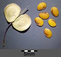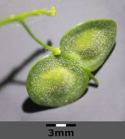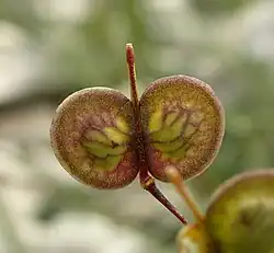 Der Fruchtstiel ist gleich lang bis doppelt so lang wie das Schötchen. Die brillenförmigen, flachen Schötchen sind etwa 4,7 Millimeter lang sowie 7 bis 12 Millimeter breit und beim Griffel sowie Stielansatz ausgerandet.[2] Die aus zwei kreisförmigen Fächern bestehende Spaltfrucht zerfällt in zwei 4 bis 7 Millimeter lange, einsamige geflügelte Nüsschen. Der Griffel zwischen den Nüsschen ist 3 bis 5 Millimeter lang.[2] Die Samen sind 2 bis 2,5 Millimeter lang, 1,5 Millimeter breit, abgeflacht und braun.[3]