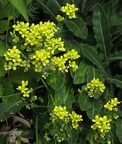 Die zwittrigen Blüten vierzählig. Die vier Kelchblätter sind gelb-grün und 2,5 bis 3 Millimeter lang.[3] Die vier gelben Kronblätter sind bei einer Länge von 4 bis 8 Millimetern schmal eiförmig.[2] Sie sind am Grund in einen sehr kurzen Nagel verschmälert und besitzen darüber jederseits einen stumpfen Zahn.[3]