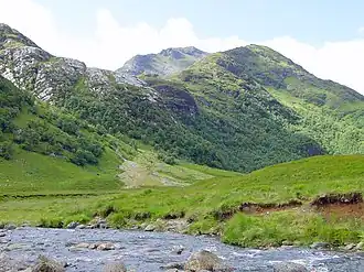 Der obere Talabschnitt wird nördlich von den Ausläufern des Ben Nevis und weiteren Bergen wie dem Aonach Mòr begrenzt. Südlich liegt die ebenfalls über 1000 Meter Höhe erreichende Bergkette der Mamores, deren höchster Gipfel der 1132 Meter hohe Binnein Mòr ist. Das Glen Nevis weitet sich dann allmählich in Richtung Rannoch Moor auf und wird zunehmend flacher. Im Rannoch Moor liegt auch der Ursprung des im oberen Talabschnitt als Water of Nevis bezeichneten River Nevis. Über einen Wanderweg quer über das Moor ist Corrour Station an der West Highland Line zu erreichen, der höchstgelegene und einsamste Bahnhof Großbritanniens. Das Tal weist einige Wasserfälle auf, darunter mit den Kaskaden der Steall Falls den zweithöchsten Wasserfall Schottlands.