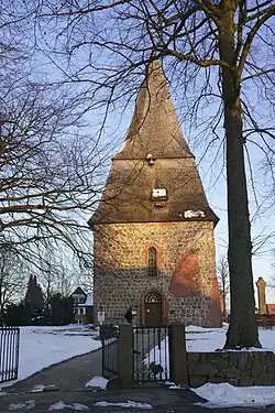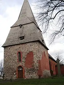 Die Mauern des wuchtigen, bis 27 m hohen Kirchturms sind bis auf einige Backsteinflächen aus gemauerten Feldsteinen auf einem Feldstein-Fundament errichtet und bis zu 2,75 m dick. Das steile, mit Schindeln gedeckte Dach des Turmes hat im unteren Drittel einen quadratischen Grundriss, der dann in einen oktogonalen Teil übergeht.