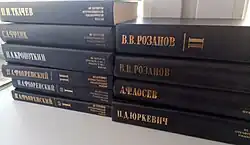 - ↑ Wie z. B. Geschichte der russischen Philosophie (Losski), Geschichte der russischen Philosophie (Senkiwskyj), Geschichte der russischen Philosophie (Jakowenko), Russische Philosophie und soziales Denken von der Aufklärung bis zum Marxismus (Andrzej Walicki), Russische Philosophie des 9.–19. Jahrhunderts (Nikandrow/Galaktianow) usw.