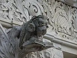 Detail der Fassade am Eingangsportal: Löwe und Eule gemeinsam in Buch lesend, im Hintergrund Fries mit Bienenkörben