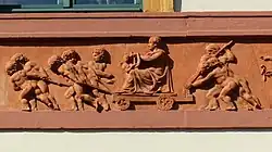 Die monumentale Plastik Goethe und Psyche befindet sich seit 1865 im Treppenhaus des Neuen Museums Weimar. Carl Steinhäuser gestaltete sie 1851 nach einem Entwurf und im Auftrag von Bettina von Arnim aus Carrara-Marmor in Rom. Seitens der Familie brachte es Bettina Vorwürfe ein, da die finanziellen Belastungen ziemlich hoch waren. Nur durch Wolfgang von Goethe bzw. die Großherzogin Maria Pawlowna konnte es vollendet werden.[1] Ursprünglicher Aufstellungsort war ab 1853 nach einem aufwendigen Transport das Tempelherrenhaus. Diese Kolossalstatue hat ein Gewicht von über 10 Tonnen. Dieser Transport wurde am Stegmannschen Haus künstlerisch thematisiert.[2] Die Nische im Treppenhaus wurde eigens für diese Monumentalstatue vorgesehen.