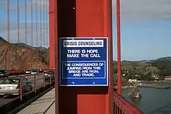 Die Golden Gate Bridge wird häufig von Personen benutzt, um sich durch einen Sprung das Leben zu nehmen. Seit der Eröffnung der Brücke im Jahr 1937 starben nach Schätzungen bis 2013 mehr als 1600[16] Menschen durch einen Sprung über das nur 1,20 Meter hohe Geländer. Mehrfach wurde in den amerikanischen Medien darüber diskutiert, ob es nicht möglich sei, wie an anderen hohen Bauwerken eine Barriere zu errichten, die Suizide wenigstens erschweren würde, was von den zuständigen Behörden allerdings immer wieder abgelehnt wurde, da man davon ausging, dass sich suizidgefährdete Menschen dann einen anderen Ort für ihren Suizidversuch suchen würden. Inzwischen gilt es allerdings als erwiesen, dass es sich gerade bei Suizidenten, die von Brücken springen, um sogenannte Impulsselbstmörder handelt. Diese unternehmen mehrheitlich (>90 Prozent) später keinen zweiten Versuch, wenn sie beim ersten Mal am Sprung gehindert wurden.[17] Der Bau einer Barriere scheiterte an der schwierigen finanziellen Lage der Betreibergesellschaft (der Zaun würde rund 50 Millionen Dollar kosten) und an ästhetischen Bedenken. 2018 wurde mit dem Bau von Schutznetzen begonnen, die zu beiden Seiten sechs Meter herausragen sollen. Die Kosten der Installation, die drei Jahre dauert, belaufen sich auf umgerechnet etwa 180 Millionen Euro.[16][18][19]