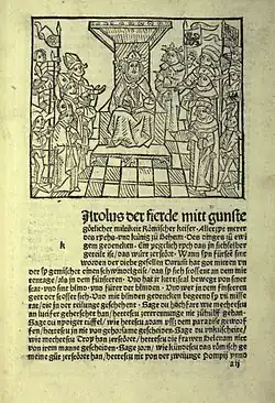 Der erste illustrierte deutsche Druck der Goldenen Bulle in deutscher Übersetzung erschien 1485 im Vorfeld der Frankfurter Königswahl Maximilians I. 1486. Darin sind auf Holzschnitten die Kaisermacher abgebildet, wie sie ihre Treueverpflichtungen gegenüber einem künftigen Kaiser erfüllen.[17]