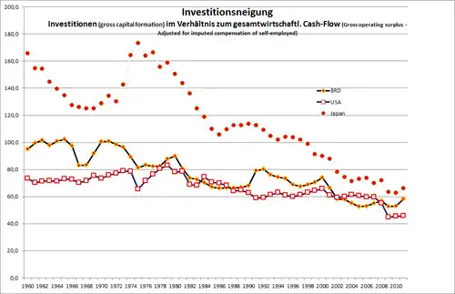 Während dieses Ergebnis also laut Arnold „dynamische Ineffizienz“ widerlegt, stellt sich andererseits die Frage, ob die Regel „Die Gewinne von heute sind die Investitionen von morgen (und die Arbeitsplätze von übermorgen)“, die sogenannte G-I-B-Formel, stimmt, wenn die Investitionsquote tatsächlich spürbar niedriger als die Profitquote ist, bzw. wie andere Untersuchungen zeigen, hinter der Profitquote immer weiter zurückbleibt (Sparschwemme). In der Abbildung sind die Bruttoanlageinvestitionen im Verhältnis zum gesamtwirtschaftlichen „Cash Flow“, hier Gewinne vor Abzug der Steuern zuzüglich der Abschreibungen dargestellt. Die so definierte Investitionsneigung geht in den Ländern der Triade USA, Japan und BRD tendenziell zurück.
