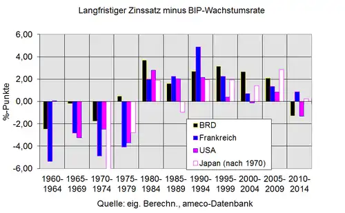 Die goldene Regel kann auch unmittelbar überprüft werden, indem man die Wachstumsrate des BIP mit dem Zinssatz vergleicht. In der Abbildung wird die Differenz gebildet zwischen BIP-Wachstumsrate und langfristigem Zinssatz. Demnach lagen die langfristigen Zinssätze bis zu den 1970er Jahren eher zu niedrig, seit den 1980er Jahren eher zu hoch. Seit den 1980er Jahren waren also die Einkommen des Produktionsfaktors Kapital gemessen an der goldenen Regel eher zu hoch.