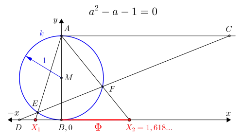 Die Goldene Zahl ist ferner eine algebraische Zahl vom Grad 2, insbesondere kann sie mit Zirkel und Lineal konstruiert werden. Damit grenzt sie sich von anderen berühmten Konstanten, wie der Kreiszahl oder der Eulerschen Zahl , ab, die transzendent, und damit niemals Nullstelle eines nicht-konstanten Polynoms mit rationalen Koeffizienten sind.
