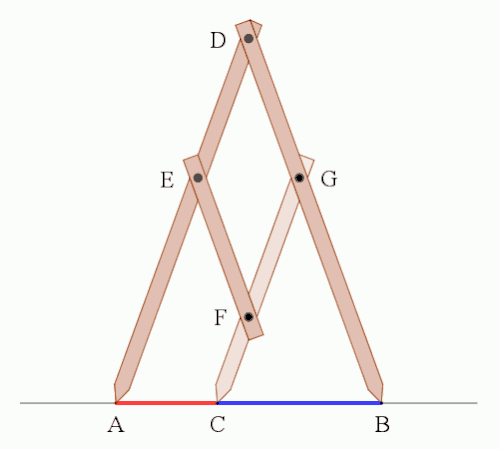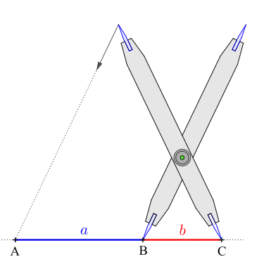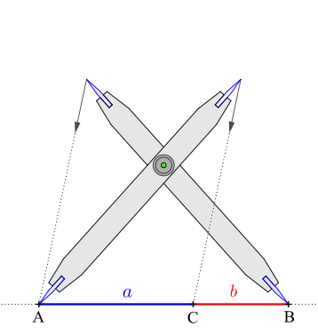 Es bezeichnen die Teilstreckenlängen der Gesamtstrecke . Es gilt dann nach Definition des Goldenen Schnitts die Relation[3]