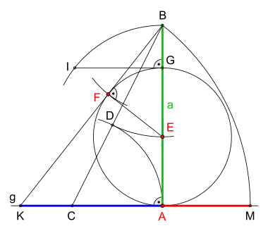 Nach dem Ziehen des Kreises mit Radius gleich um den Mittelpunkt und dem anschließenden Festlegen der zueinander parallelen Tangenten an den Punkten und , werden auf den entsprechenden Tangenten, wegen und ,[5] die Punkte und bestimmt. Eine Verbindung des Punktes mit erzeugt auf dem Kreisbogen die Schnittpunkte und . Die beiden abschließenden geraden Linien ab Punkt durch und liefern auf der -Achse die Punkte und mit den Längen und .[5]