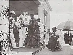 Scheinbar im Widerspruch zu dieser Überlieferung steht die Übergabe des Goldenen Stuhls der Ga in einem feierlichen Akt an den damaligen Prince of Wales (den späteren König Edward VIII.) während dessen Aufenthaltes an der Goldküste im Jahre 1925 (siehe Abbildung). Dies scheint jedoch nur eine symbolische Übergabe gewesen zu sein, bei der dem Prinzen nur ein kleineres, vergoldetes Modell des Stuhles als Zeichen der Anerkennung der britischen Oberhoheit überreicht wurde. Vielleicht wurde dabei aber auch eine Neuanfertigung des Stuhls übergeben.