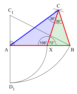 Die oben beschriebene Zerlegung von in die Teildreiecke und liefert beide Formen des Goldenen Dreiecks. Beide Formen treten also stets gemeinsam auf.[10] Sie ergeben sich regelmäßig bei der Konstruktion mit Zirkel und Lineal von regulärem Fünfeck und regulärem Zehneck. Die Winkel , und sind also allein mit Zirkel und Lineal konstruierbar.[11]