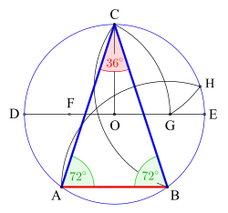 Ist der Umkreis gegebenen, reicht eine konstruierte Seitenlänge des Fünfecks aus, um die Länge der Grundseite des Goldenen Dreiecks zu erhalten.[8]