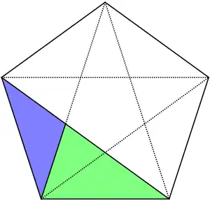 Mit den Ähnlichkeitssätzen ergibt sich, dass entweder oder zu ähnlich ist. Daraus zieht man die Folgerung, dass die Innenwinkelsumme gleich dem Fünffachen des kleinsten Winkels ist. Folglich ist einer der Winkel gleich . Ist dies der Winkel an der Spitze von , so ist ein Goldenes Dreieck erster Art. Ist es ein Basiswinkel, so ist ein Goldenes Dreieck zweiter Art. Mit dem Innenwinkelsummensatz ergibt sich dann, dass im ersten Fall das Innenwinkeltripel gleich sein muss, im zweiten Fall dagegen allein in Frage kommt.[4][5]