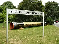 Der Goldhort war Mittelpunkt der Sonderausstellung Im Goldenen Schnitt – Niedersachsens längste Ausgrabung[77][78], die zwischen August 2013 und März 2014 im Niedersächsischen Landesmuseum gezeigt wurde. Thema waren die zwischen 2010 und 2013 vorgenommenen Ausgrabungen auf der Trasse der Nordeuropäischen Erdgasleitung. Sie stellten das bisher größte Archäologieprojekt in Niedersachsen dar und führten mit etwa 150 Fundstellen zur Entdeckung weitgehend unbekannter Siedlungsstellen sowie Gräberfelder. Die Ausstellung umfasste neben dem Goldhort rund 250 Exponate.[79] Dabei werden acht Fundstellen, die während des Pipelinebaus in Niedersachsen entdeckt wurden, näher vorgestellt.[80]