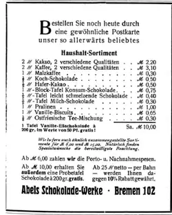 - ↑ Abels Schokoladen Werke auf www.veikkos-archiv.com, Januar 2018