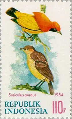 Darstellung eines Paares Goldlaubenvögel auf einer indonesischen Briefmarke aus dem Jahre 1984
