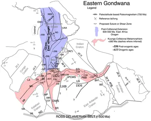 Gondwana umfasste die damals in einer Landmasse vereinigten Kontinente beziehungsweise Kratone von Südamerika, Afrika, Antarktika, Australien, Arabien, Madagaskar, Neuguinea, Zealandia und Indien.
