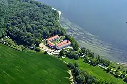 Eine imposante Allee führt, zwischen dem jeweils zwei Kilometer entfernten Putbus und Lauterbach verlaufend, auf die beeindruckende Fassade. Das Bauwerk wurde im Laufe der Zeit mehrmals umgebaut. Nach dem Zweiten Weltkrieg und nach der Gründung der DDR diente es zwischen 1958 und 1990 als Ferienheim des VEB Bandstahlkombinats Hermann Matern des Stammwerkes VEB Eisenhüttenkombinates Ost (EKO) Eisenhüttenstadt. Dieses Betriebsferienheim wurde der Orden Banner der Arbeit verliehen. Das zugehörige Kinder- und Jugendferienlager lag 600 m weiter östlich im Wald.[3] Von 1991 bis 2007 stand es leer und ein Investor wurde gesucht.