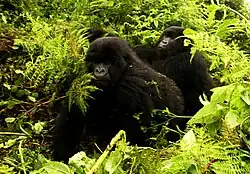 - Der Berggorilla kommt in zwei getrennten Populationen im Virunga-Nationalpark und im Bwindi-Impenetrable-Nationalpark vor. Unterstützt von der starken medialen Präsenz dieser Unterart haben Schutzmaßnahmen zu einem leichten Ansteigen der Populationen geführt. Heute gibt es rund 1000 Tiere, davon rund 400 im Bwindi-Nationalpark.[27] Trotzdem wird die Unterart weiterhin als „vom Aussterben bedroht“ geführt.