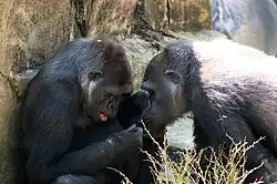 Die Lebenserwartung der Tiere liegt bei 35 bis 40 Jahren, in menschlicher Obhut können Gorillas jedoch älter als 50 werden. Massa († 1984) im Zoo von Philadelphia war mit 54 Jahren lange der älteste bekannte Gorilla weltweit,[12] danach Jenny († 2008) im Zoo von Dallas mit 55 Jahren.[13] Bis Januar 2017 galt Colo (* 22. Dezember 1956; † 17. Januar 2017) im Zoo von Columbus als das älteste noch lebende Tier.[14] Sie war zudem der erste jemals in Gefangenschaft geborene Gorilla. Am 20. August 2018 wurde im Tiergarten Nürnberg der Gorilla Fritz im Alter von vermutlich 55 Jahren eingeschläfert, der 1963 im Kameruner Dschungel geboren und als Baby gefangen wurde.[15] Derzeit ist Fatou (* 1957) im Berliner Zoo mit 68 Jahren der älteste bekannte Gorilla der Welt.