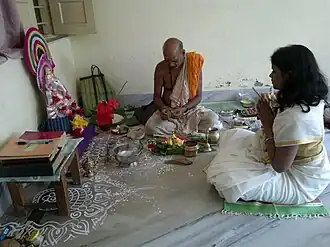 Im Tempel bietet sich ebenfalls die Möglichkeit zum Gottesdienst. Anfang und Ende sind offen, jeder Tempel entwickelt seinen eigenen Ablauf. Zentraler Aspekt des hinduistischen Gottesdienstes ist das Darshan, der wechselseitige Anblick von Gläubigen und Gott.[13] Meist ist der Besuch im Tempel mit einer Opfergabe verbunden.