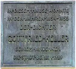 Ebenfalls während seiner beiden letzten Berliner Jahre war Keller häufig zu Gast im Hause des Verlegers Franz Duncker und seiner Gattin Lina geborene Tendering in der Johannisstrasse 11 (Gräflich Rossisches Palais), seit 1855 in der Potsdamer Straße 20 und ungefähr seit 1877 in der von-der-Heydt-Strasse.[55] In diesem Kreis hielten sich meist jüngere, demokratisch eingestellte Künstler und Literaten auf, so der Journalist Julius Rodenberg und der Maler Ludwig Pietsch. Vom Letzteren stammt die folgende Erinnerung an den Dichter: