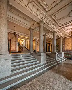 Beim Umbau des bisherigen Verwaltungsgebäudes zu einem höchstrichterlichen Justizgebäude galt es, einerseits die räumlichen und technischen Anforderungen an einen zeitgemässen Gerichtsbetrieb zu erfüllen und anderseits den denkmalpflegerischen Aspekten Rechnung zu tragen. Die Interventionen am Gebäude selbst beschränkten sich auf das unbedingt Notwendige (u. a. punktuelle Fassadenrenovationen, neue Metall/Glas-Eingangstüren, Fenster mit Isolierverglasung). Im Innern wurde in Zusammenarbeit mit der Denkmalpflege die ursprüngliche Substanz an Wänden, Böden und Decken restauriert und soweit erforderlich ergänzt und konserviert. Das Material- und Farbkonzept für die neu gestalteten Bauteile wurde aus der bestehenden Substanz abgeleitet. Ein fein abgestimmtes Lichtkonzept verleiht den Räumlichkeiten eine angenehme Atmosphäre. Neu erstellt wurde der mit klar strukturierten Pulten aus Eichholz möblierte Gerichtssaal.