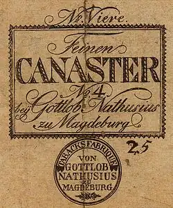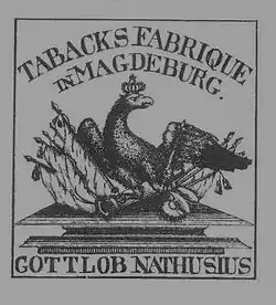 - ↑ gem. einer Bekanntmachung des Johann Gottlob Nathusius am 4. März 1814 betreffend die Rückkehr seiner Tabakfabrikation nach Magdeburg