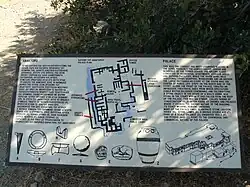 Nördlich der Treppe erreicht man einen Korridor, der zunächst nach Westen führt, nach Norden abknickt und in einen offenen Hof mündet. Westlich und nördlich des Hofes lagen längliche Lagerräume, südlich befand sich der Thronsaal, der an drei Seiten von Sitzbänken umgeben war. Vom Thronsaal führte ein schmaler Korridor mit Treppe in das Obergeschoss. Vom offenen Hof nach Norden sieht man links zunächst eine weitere Treppe ins Obergeschoss, dahinter gelangte man zum Westeingang des Palastes. Setzt man den Weg nach Norden fort so gelangt man zu einem kleinen Badezimmer.