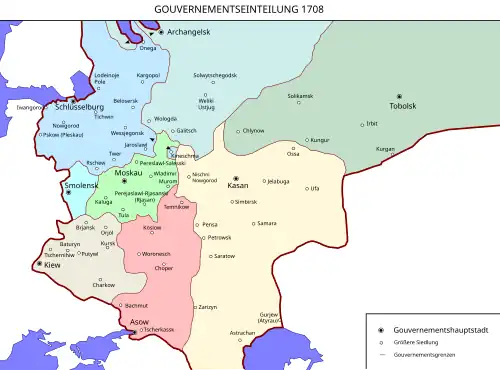 Asow war eines der ersten 8 Gouvernements, die während der Provinzreform von 1707 bis 1710 gegründet wurden. Am 1. März 1707 unterzeichnete der Zar die endgültige Liste der Städte des Gouvernements Asow. Offiziell wurde es gemäß einem Dekret vom 29. Dezember 1707 gegründet. Das nominelle Verwaltungszentrum des Gouvernements vor der Umsetzung der Bestimmungen des Friedens vom Pruth im Januar 1712 war die Stadt Asow. Dort befand sich die Residenz des Gouverneurs Iwan Tolstoi (1709–1710) und seine Kanzlei, die Asowsche Ordenskammer. Ein bedeutender Teil der allgemeinen Provinzfunktionen wurde vom Landrichter P. Kikin wahrgenommen, der in Tambow tätig war.[1][2][3]