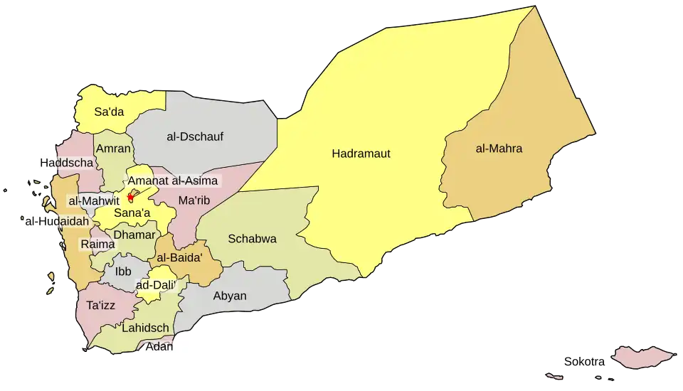 2014 wurde bekannt, dass die Regierung den Jemen in sechs Regionen gliedern will, wobei aber der Hauptstadtbezirk als separate, siebte Regionaleinheit erhalten bleiben soll.[2]