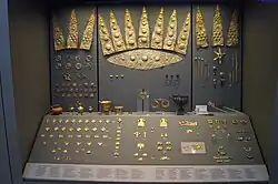 An Grabbeigaben fanden sich links und rechts der Toten zahlreiche Bronzemesser, Schwerter und Werkzeuge. Drei Bronzemesser waren mit Gold und Silber eingelegt. Man fand mehrere goldene Becher und Gefäße und zu ihren Füßen Kupfergefäße. Bemerkenswert ist eine sechseckige Holzdose. Es sind sechs Goldbleche erhalten, die an der Dose befestigt waren. Zwei sind mit Spiralmuster verziert, zwei weitere zeigen die Jagd eines Löwen auf eine Antilope und auf den letzten zwei ist die Jagd eines Löwen auf einen Hirsch dargestellt.[6]