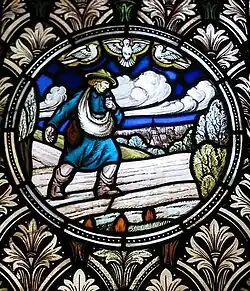 Die gleichfalls kunstvollen Glasfenster von 1909 im Vorraum zeigen zur Rechten Fischer im Gröbener Kietz und zur Linken laut Textzeile im Fenster einen „Gröbener Besitzer“ auf dem Feld.