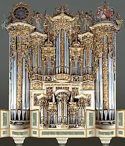 Die Orgel steht an der Schwelle von Renaissance und Frühbarock. Die äußere Gestaltung des Gehäuses weist italienischen Einfluss auf. Auffallend ist das ausladende Schnitzwerk am ganzen Gehäuse mit Ornamenten, Figuren, stilisierten Musikinstrumenten und Cheruben. Christlichen Symbolen stehen heidnische gegenüber, die anscheinend im Wettstreit miteinander stehen.[13] Zudem finden sich zahlreiche Bemalungen und Vergoldungen. Die Mittelpfeifen in den polygonalen oder Spitztürmen sind vollständig mit Ornamenten belegt. Die Gesimse sind reich profiliert. Der Registerbestand war eine Sammlung aller bis dahin bekannten Register, wie sie in der Organographia des Praetorius aufgeführt sind. Sechs Werke waren auf acht Windladen und zwei Manuale und Pedal verteilt. Ungewöhnlich reich war das Pedalwerk ausgestattet, das sich aus Groß- und Kleinpedal zusammensetzte. Weitere Register standen auf einer separaten Windlade im Gehäuse des Oberwerks. Die Labialpfeifen wiesen einen hohen Zinnanteil auf, die Schallbecher der Zungenstimmen waren aus reinem Messing gefertigt.[14] Im Oberwerk standen die Prospektpfeifen ohne Kondukte direkt auf der Lade.