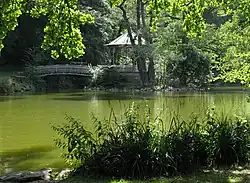 Entstanden 1879 bis 1885 als Landschaftspark nach Plänen des Stadtgärtners Maximilian Wilhelm Schmöger[18], gehört der Möslepark ⊙ zu den ältesten Anlagen Freiburgs. 1877 wurden zunächst südlich der Bahnlinie, im heutigen Stadtteil Waldsee, zwei Weiher für die Brauerei Neumeyer[19] zur Eisgewinnung angelegt. (Ein früheres Gaststättengebäude dieser Brauerei ist heute noch am Schwabentorring Ecke Kartäuserstraße zu sehen.) Der 1873 gegründete Verein zur Verschönerung der Stadt regte kurz darauf die Schaffung des Parks an. Seinen Namen verdankt er dem Wasserreichtum. Die ältesten Quellfassungen der Stadt sind hier zu finden. 1881 wurde ein dritter Weiher angelegt, der heute, verschmolzen mit den beiden ersten, den Waldsee bildet. Am Westufer befindet sich das Waldseerestaurant mit Seeterrasse, welches 1883[20] eröffnet wurde und heute noch als Ausflugsgaststätte und Veranstaltungsstätte bei der Freiburger Bevölkerung großen Zuspruch erfährt. Nach dem Ersten Weltkrieg wurde der stark verwilderte elf Hektar große Park durchforstet und geringfügig umgestaltet. 2015 wurde der westliche, und 2016 der östliche Teil ausgelichtet, um den früheren Wechsel von dichten und lichten Zonen wiederherzustellen.[18][21]