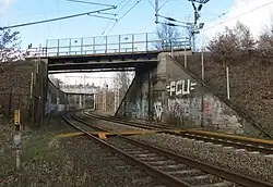 1,5 Kilometer lange zweigleisige Verbindung von der Görlitzer Bahn aus Richtung Schöneweide zum Außenring Richtung Schönefeld, die Gleise beider Richtungen sind räumlich getrennt - 6146 Berlin-Grünau–Grünauer Kreuz Süd