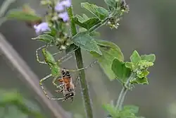 Weibchen beim Verzehr einer Biene. Bienen und andere Blütenbesucher zählen zur Hauptbeute der Grünen Luchsspinne.
