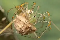 Das Weibchen beginnt für gewöhnlich zwischen 11:00 und 16:00 Uhr mit der Fertigung des Eikokons und benötigt etwa fünf Stunden für den gesamten Aufbau. Das anfangs angelegte Fundament des Kokons setzt sich aus einer polsterartigen Spinnfläche zusammen, an die ein schalenartiges und zum Boden geöffnetes Gebilde befestigt wird. In diese Mulde werden dann die Eier gelegt, ehe diese gänzlich mit Seide umschlossen und somit auch der Kokon vollendet wird. Letztere Schritte nehmen fast die Hälfte der Konstruktionszeit vom Eikokon in Anspruch.[35]