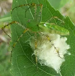 Ein Weibchen in seinem Brutgespinst mit erbeuteter Wespe, umgeben von Nistfliegen (Milichiidae sp.). Das Muttertier der Grünen Luchsspinne verbleibt auch noch für einige Zeit nach dem Schlupf bei seinen Nachkommen.