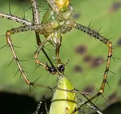 Weibchen mit erbeuteter Jagdspinne (Pisauridae sp.). Durch ihre effektive Jagdweise kann die Grüne Luchsspinne auch derart wehrhafte Beutetiere vergleichsweise leicht überwältigen.